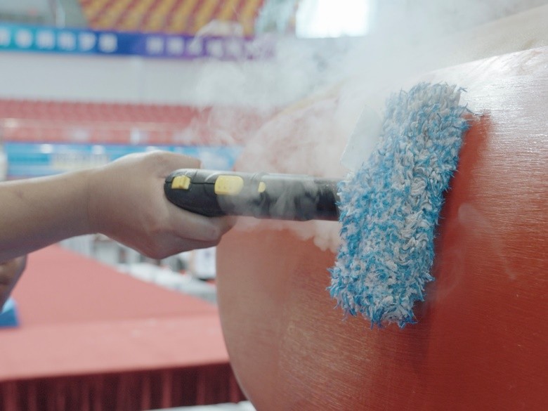 每日比赛结束后,卡赫清洁团队都会使用蒸汽清洁机SG 4/4对场地内的鞍马等比赛器材进行深度清洁。它快速释放的高温高压蒸汽,灭菌率高达99.999%,能快速去除残留在器材上的汗渍、镁粉等污渍。而且整个清洁过程只需要水,无需使用任何化学药剂,更环保更安全。