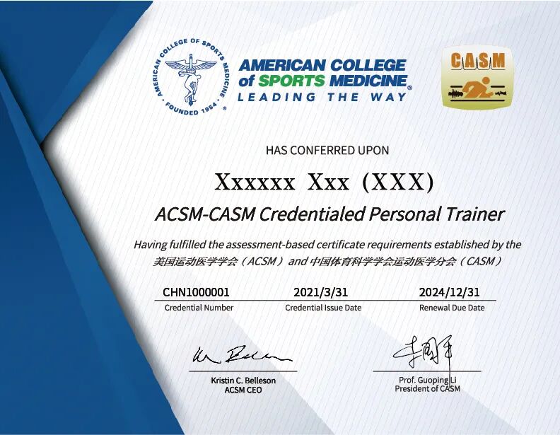 ACSM-CASM中文CPT认证证书式样