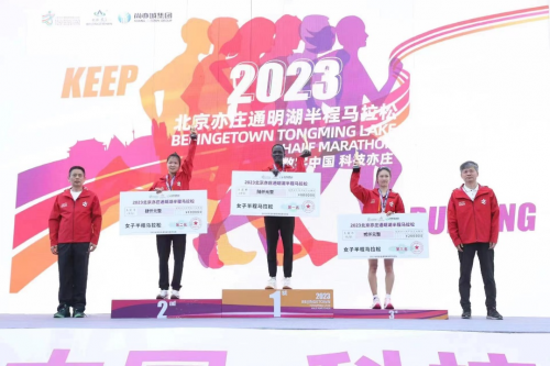 经过激烈的角逐,来自肯尼亚的SAMUEL KALALEI和NAOMIKAKOKOLIMAMUREI分别凭借1小时5分51秒和1小时15分54秒的成绩获得2023北京亦庄通明湖半程马拉松男子组和女子组冠军。左仁贵、沈金坤分别为男、女子组前三名获奖选手颁奖。